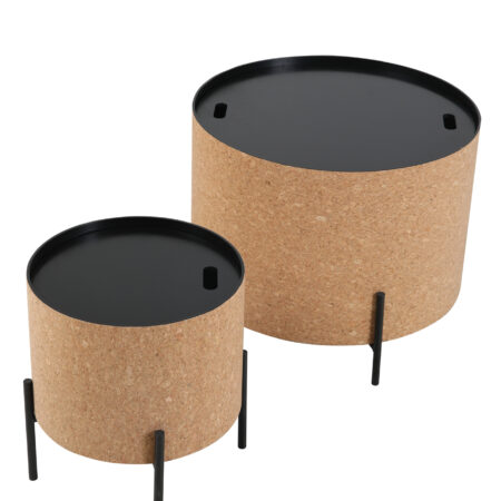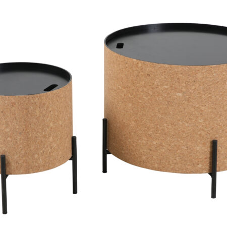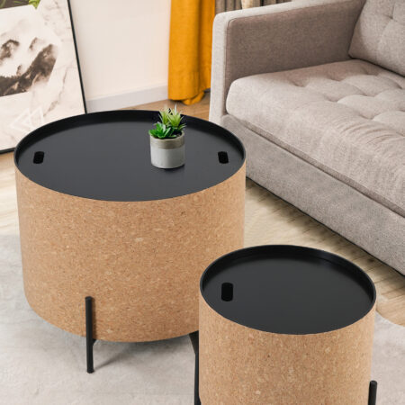 Möbel aus Kork sind nicht nur ein außergewöhnlicher Design-Hingucker, sie sind durch die positiven Eigenschaften des Naturmaterials auch sehr praktisch. Die robuste Korkoberfläche strotz den Strapazen des Alltags, durch das leichte Gewicht sind die Couchtische zusätzlich im Handumdrehen umplatziert – Immer genau dort bereit, wo gerade zusätzliche Ablagefläche benötigt wird. Die Tische kommen im praktischen 2er Set mit unterschiedlichen Grüßen und Höhen, so dass sie optimal nebeneinander platziert werden können, für ein harmonisches Gesamtbild. Der Kontrast mit den schwarzen Metallbeinen sorgt für eine coole und moderne Optik, welche das extravagante Design gekonnt abrundet. Besonderer Clou: Die abnehmbaren Tischplatten bieten cleveren Stauraum im Inneren der Tische.